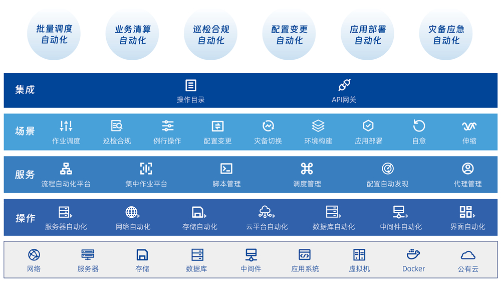 提供組織級全流程自動化運維,可以把企業最佳的運維流程固化為模板,實現對任意數量 IT 資源的批量標準化執行,完成配置變更、數據收集、環境構建、故障自愈、資源調整、應用部署、自動巡檢等場景的自動化,顯著提升日常運維工作的效率和可靠性,縮短操作時間、降低運維操作的成本和操作風險。